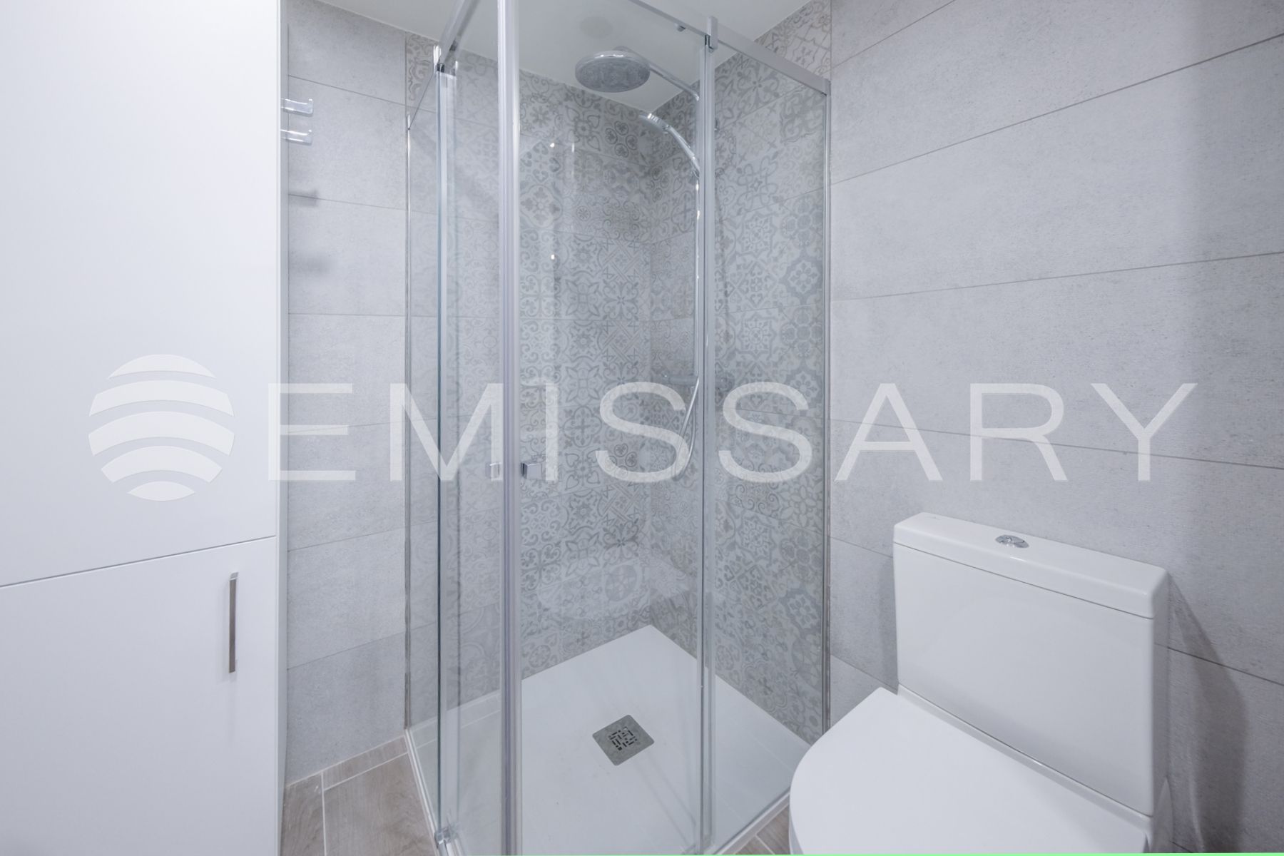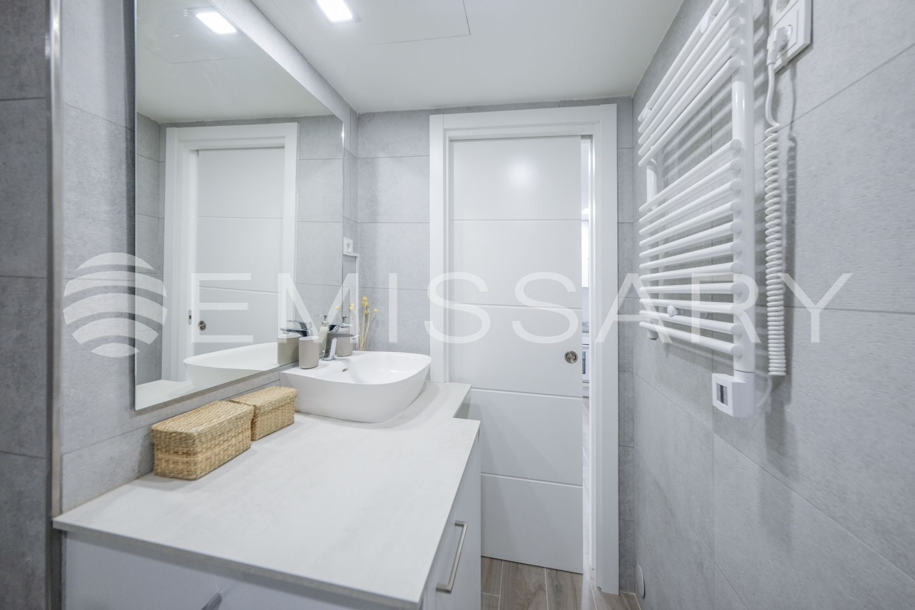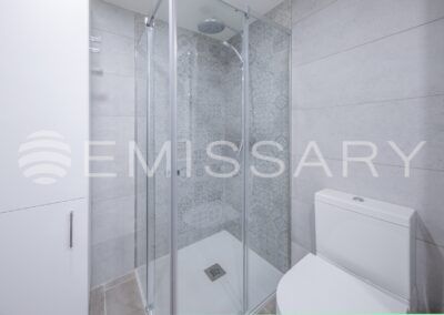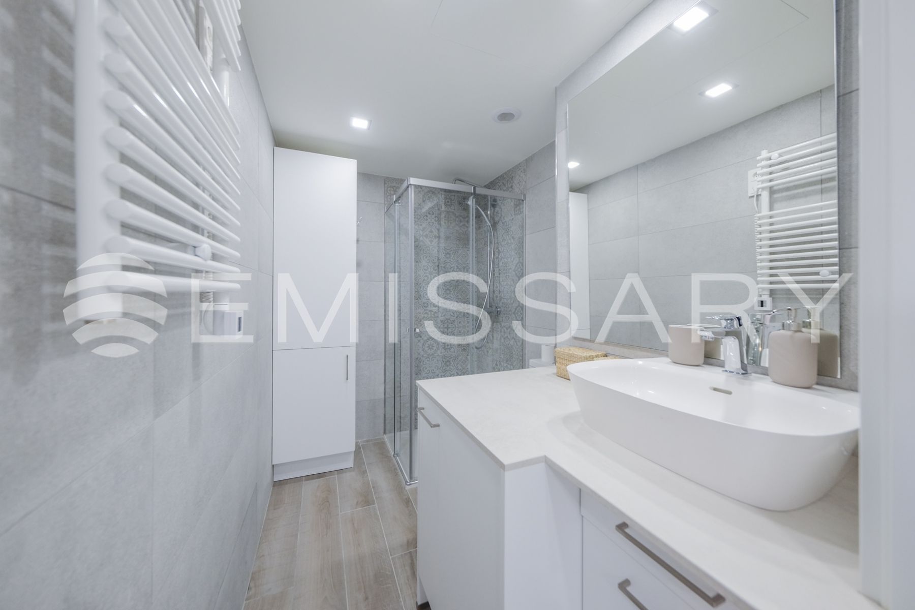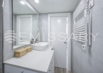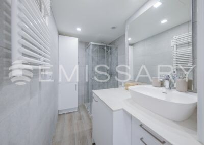 - Baño con plato de ducha, mampara de cristal, lavabo sobre encimera, muebles y radiador toallero.