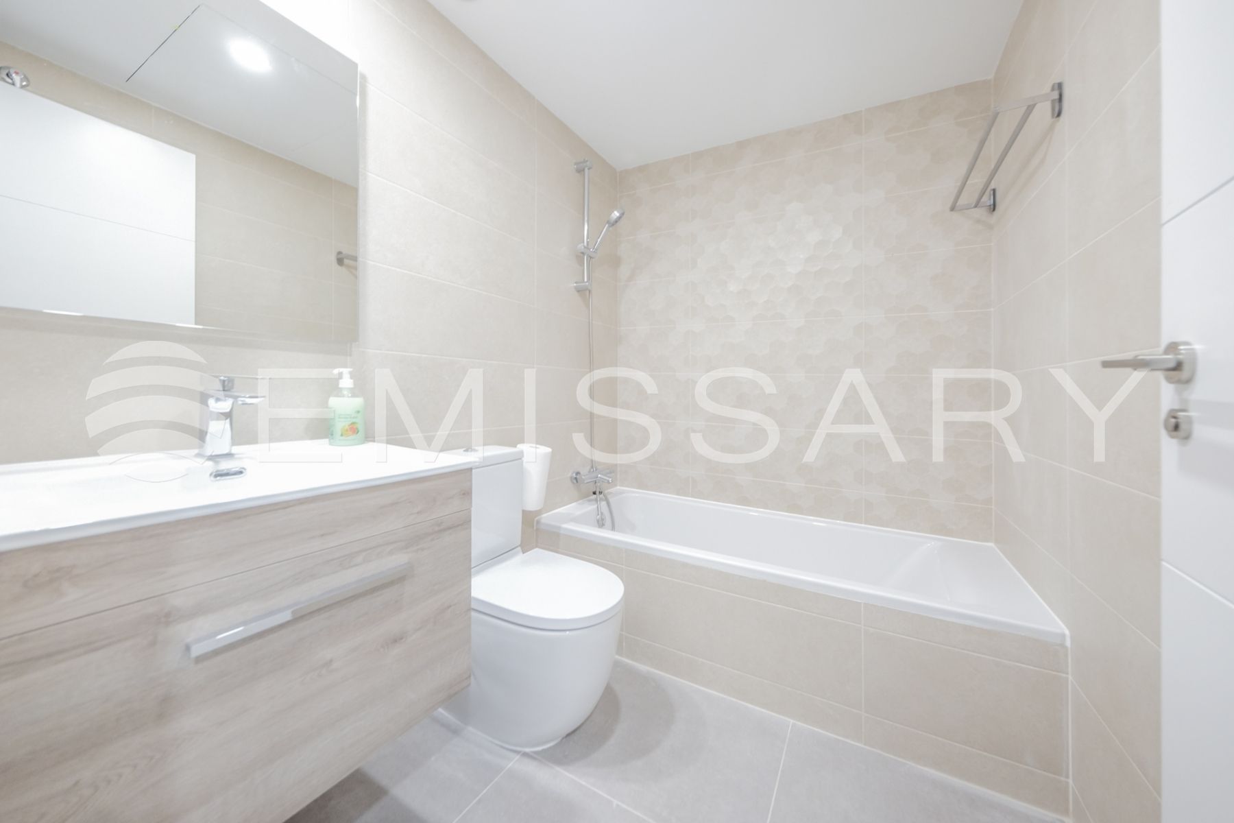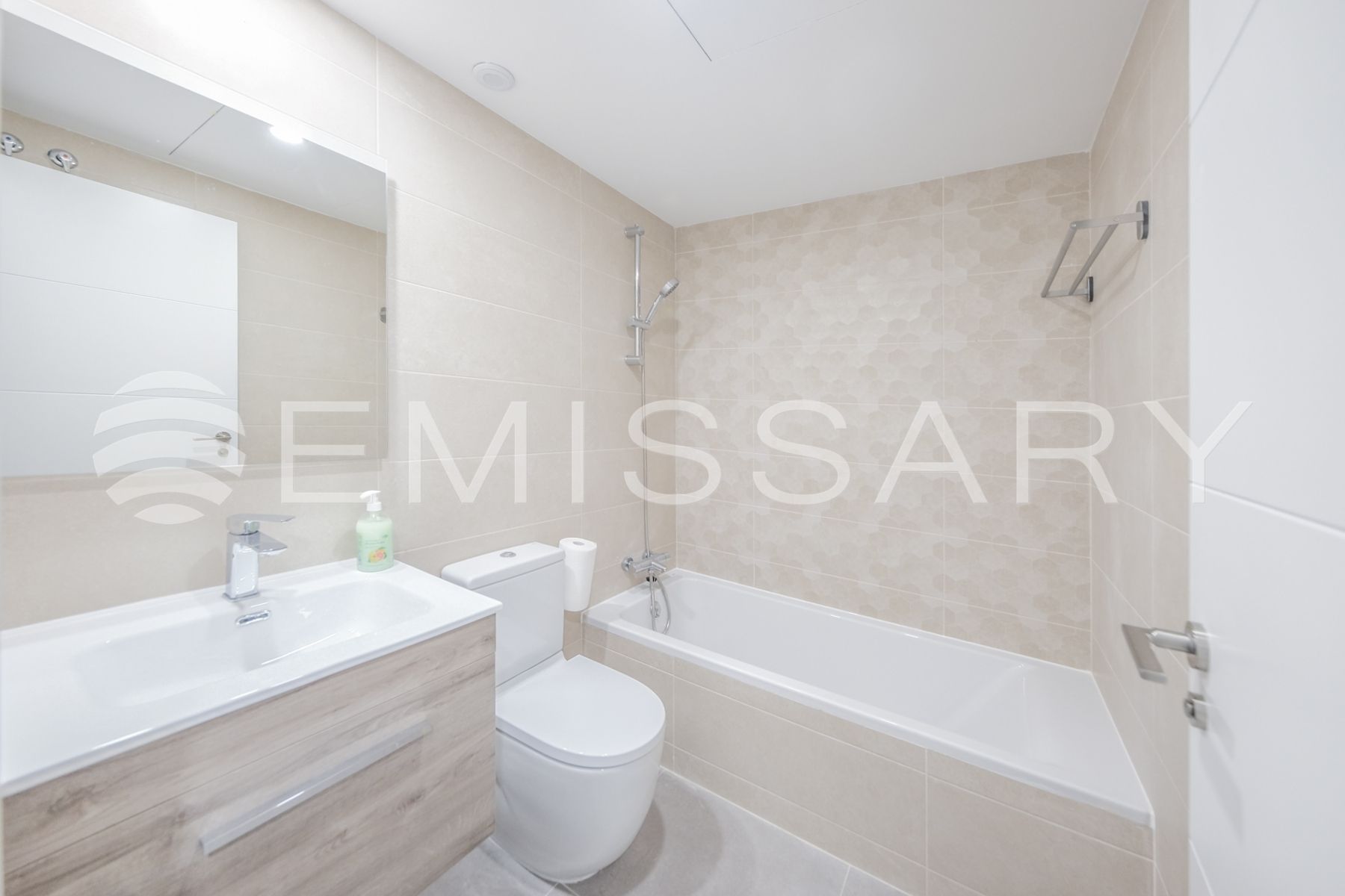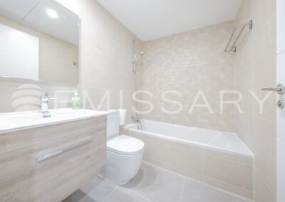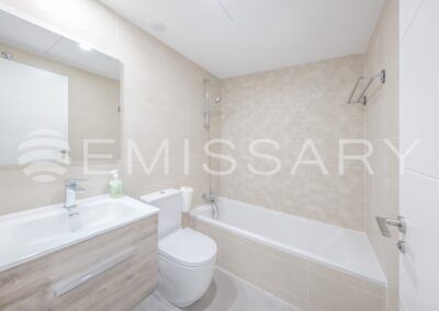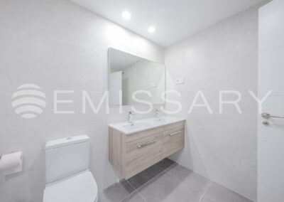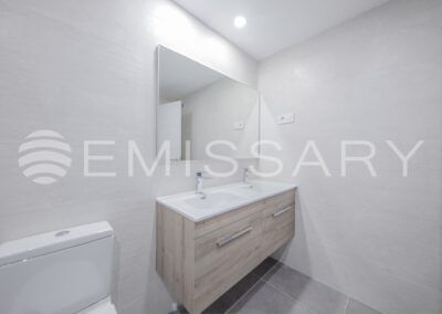 - Baño secundario con alicatados de primera calidad, lavabo encastrado sobre mueble de madera y bañera.