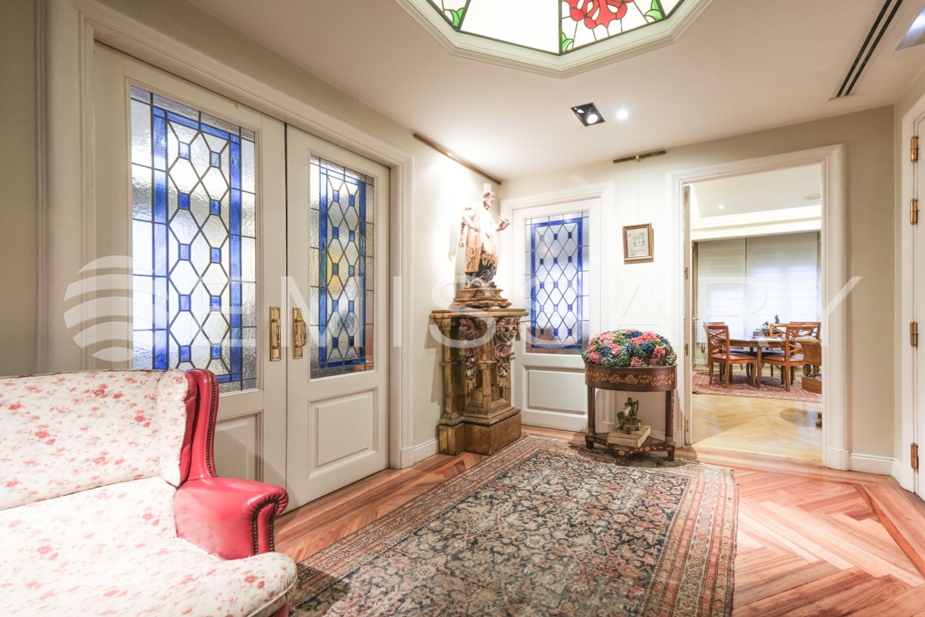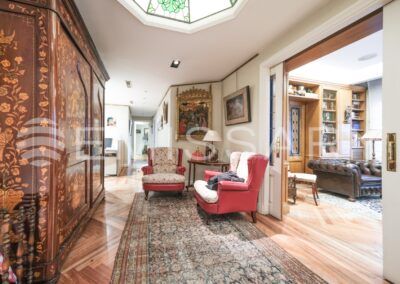 Hall de entrada desde al que se accede por un lado a la zona pública dividida en comedor, salón principal y salita de estar.